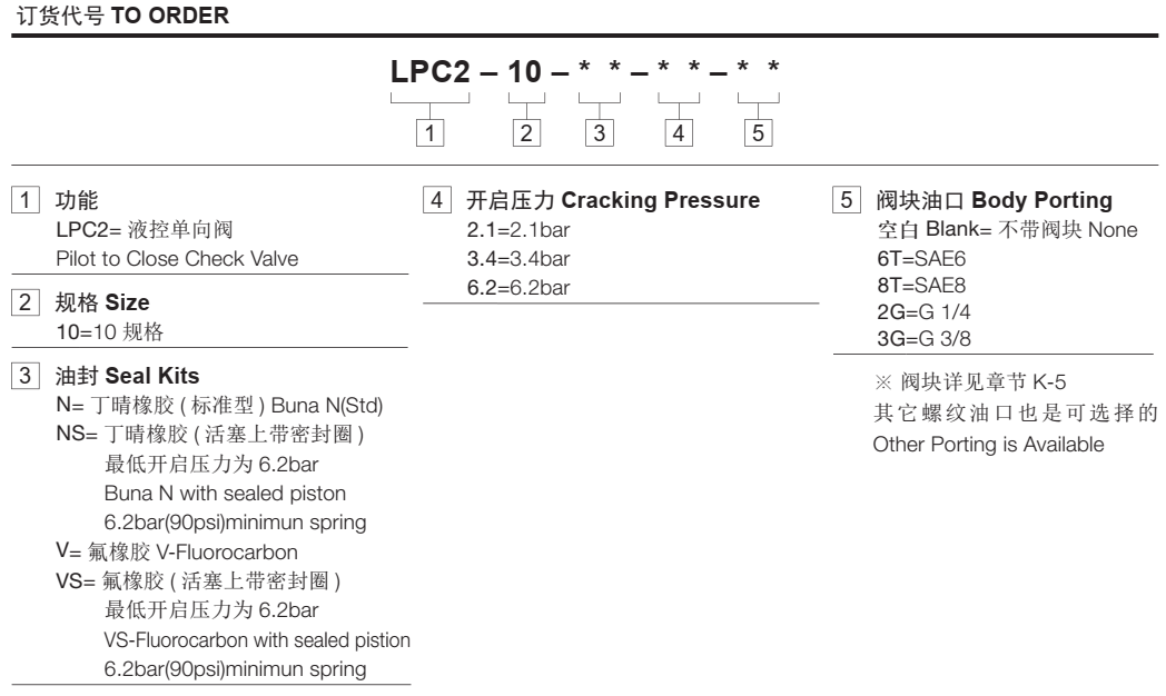 6.2=6.2bar控制比3:1温度-40°F to +250°F(-40°C to +120°C)油液Mineral-based fluids with viscosities of 7.4 to 420 cSt.(矿物油粘度)阀块材料6061-T6铝,允许使用最大压力207bar 钢和球铁允许使用最大压力350bar -