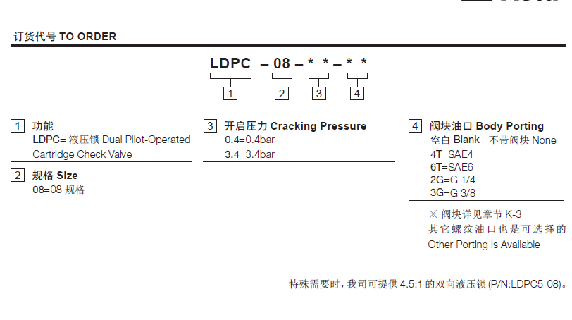 3.4=3.4bar控制比2.5:1温度-40°F to +250°F(-40°C to +120°C)油液Mineral-based fluids with viscosities of 7.4 to 420 cSt.(矿物油粘度)阀块材料6061-T6铝,允许使用最大压力207bar 钢和球铁允许使用最大压力350bar -