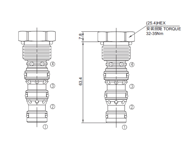 ②口或③口的压力超过④口或①口的负载压力的1/3 时,④到③,①到②打开。