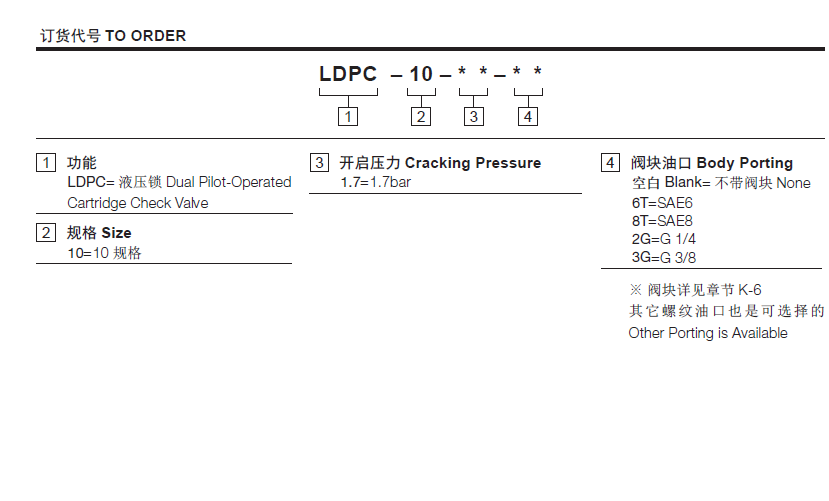 工作压力240Bar流量请查看《压力-流量曲线图》插孔10-4过滤参考《油液清洁度》内泄漏单向阀泄漏:2 drops/min.(滴/分)max. at 240bar开启压力1.7=1.7bar控制比3:1温度-40°F to +250°F(-40°C to +120°C)油液Mineral-based fluids with viscosities of 7.4 to 420 cSt.(矿物油粘度)阀块材料6061-T6铝,允许使用最大压力207bar 钢和球铁允许使用最大压力350bar -