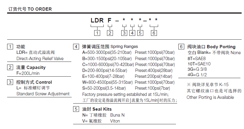 工作压力350Bar流量请查看《压力-流量曲线图》插孔SUN T-3A过滤参考《油液清洁度》回座时最大泄露10 drops/min(滴/分)闭合压力>80% of setting pressure(设定压力)