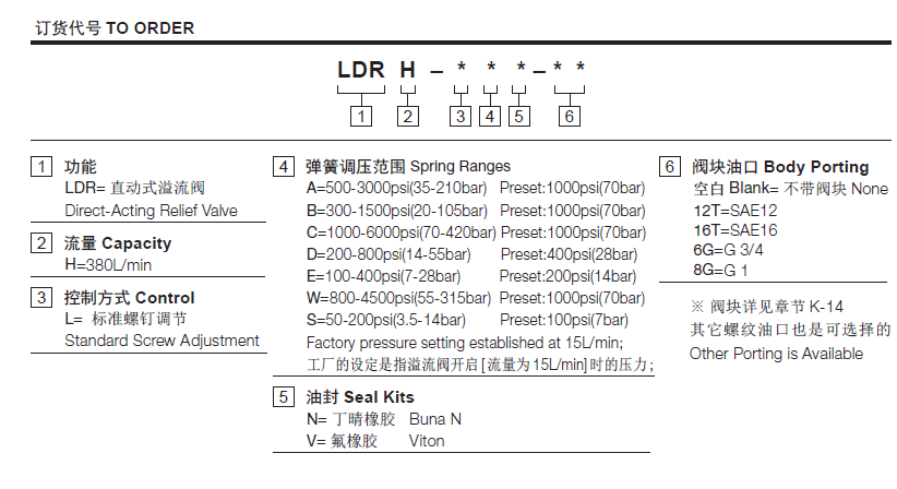 S 3.5- 14 bar; Preset(预设定): 7bar温度-40°F to +250°F(-40°C to +120°C)油液Mineral-based fluids with viscosities of 7.4 to 420 cSt.(矿物油粘度)阀块材料钢和球铁允许使用最大压力350bar -