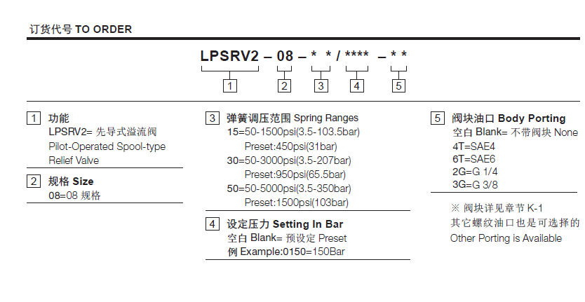3.45bar to 350bar, preset预设定: 103bar温度-40°F to +250°F(-40°C to +120°C)油液Mineral-based fluids with viscosities of 7.4 to 420 cSt.(矿物油粘度)阀块材料钢和球铁允许使用最大压力350bar -