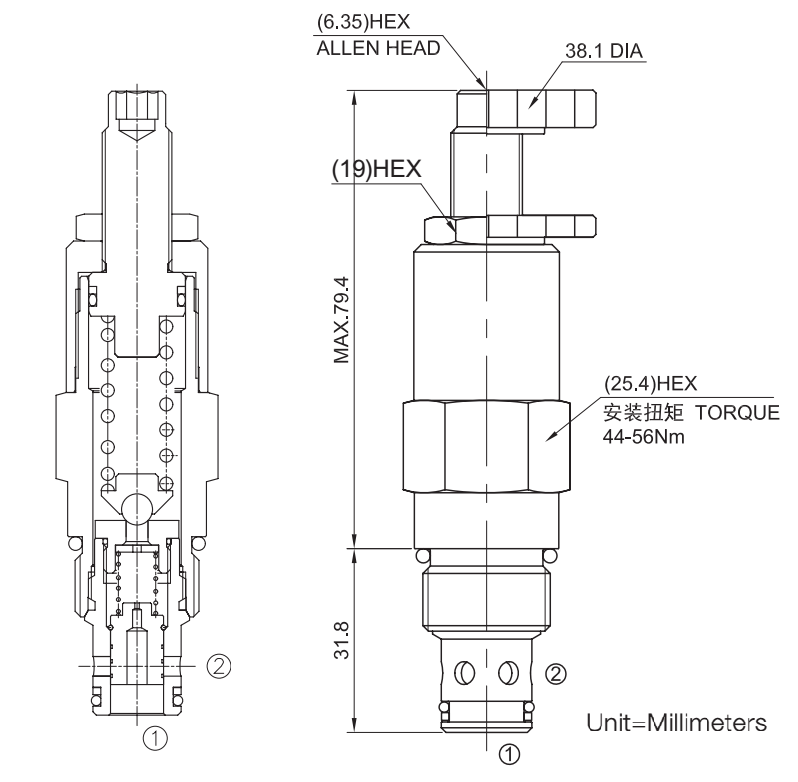 阀体①口和②口不通, 直到①口压力超过设定压力且打开先导阀芯。这样, 先导阀芯