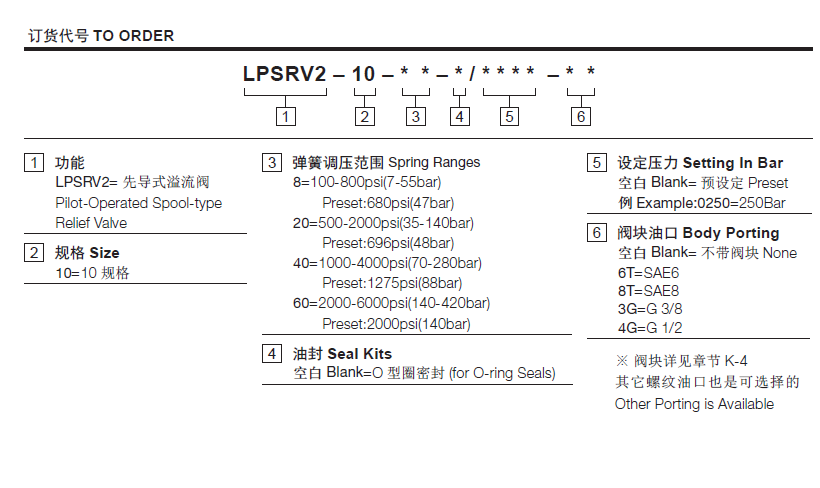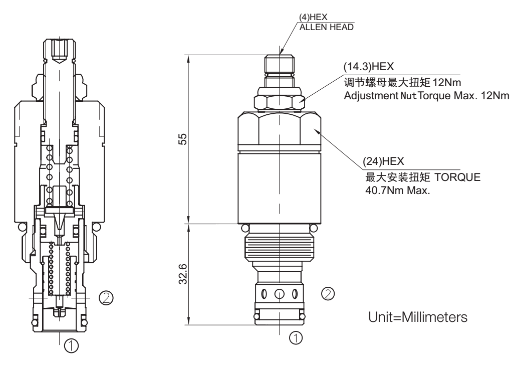 阀体①口和②口不通, 直到①口压力超过设定压力且打开先导阀芯。这样, 先导阀芯