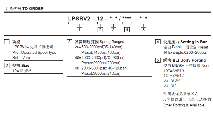 140 to 420 bar: preset预设定:210 bar温度-40°F to +250°F(-40°C to +120°C)油液Mineral-based fluids with viscosities of 7.4 to 420 cSt.(矿物油粘度)阀块材料钢和球铁允许使用最大压力350bar -