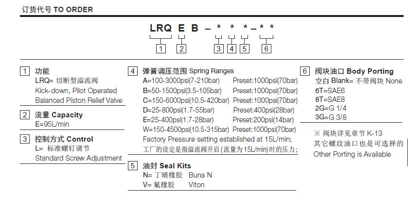 W 10.5- 315bar; Preset(预设定):70bar温度-40°F to +250°F(-40°C to +120°C)油液Mineral-based fluids with viscosities of 7.4 to 420 cSt.(矿物油粘度)阀块材料钢和球铁允许使用最大压力350bar -