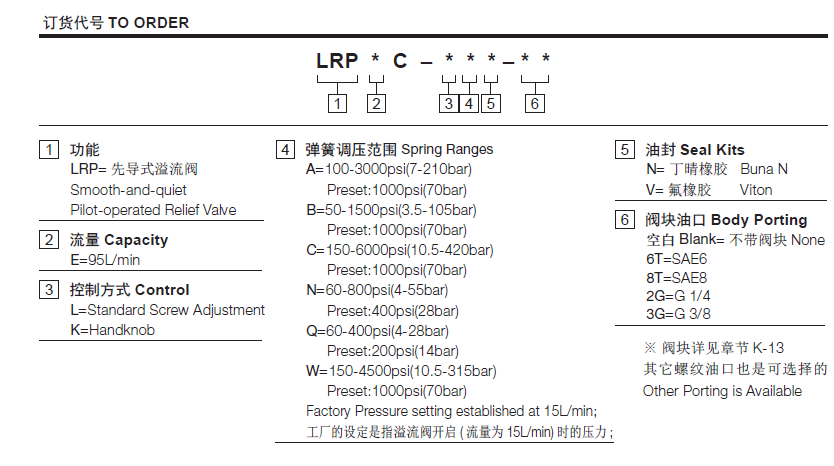 工作压力350Bar流量95 L/min.插孔SUN T-10A过滤参考《油液清洁度》内泄漏30 cc/min. at 70bar.响应时间10 ms弹簧调压范围A 7 to 210 bar, preset预设定:70bar