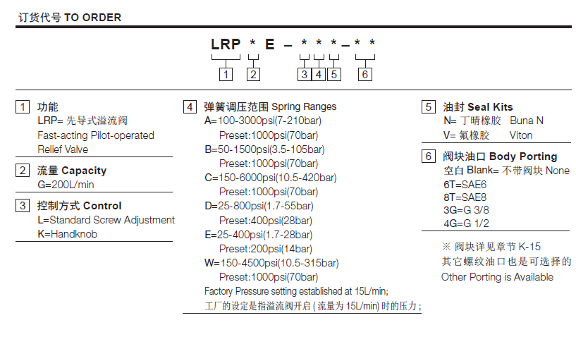 W 10.5 to 315 bar, preset预设定:70bar温度-40°F to +250°F(-40°C to +120°C)油液Mineral-based fluids with viscosities of 7.4 to 420 cSt.(矿物油粘度)阀块材料钢和球铁允许使用最大压力350bar -