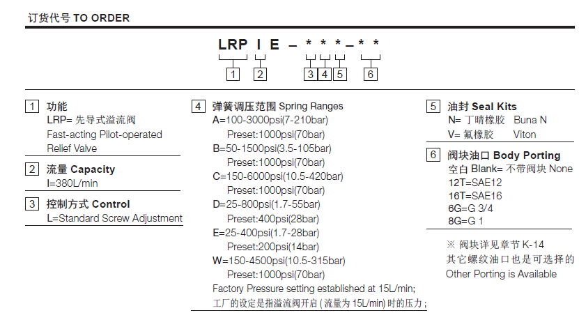 W 10.5 to 315 bar, preset预设定:70bar温度-40°F to +250°F(-40°C to +120°C)油液Mineral-based fluids with viscosities of 7.4 to 420 cSt.(矿物油粘度)阀块材料钢和球铁允许使用最大压力350bar -