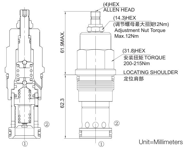 ②口背压会按1:1 叠加到阀的设定压力上。