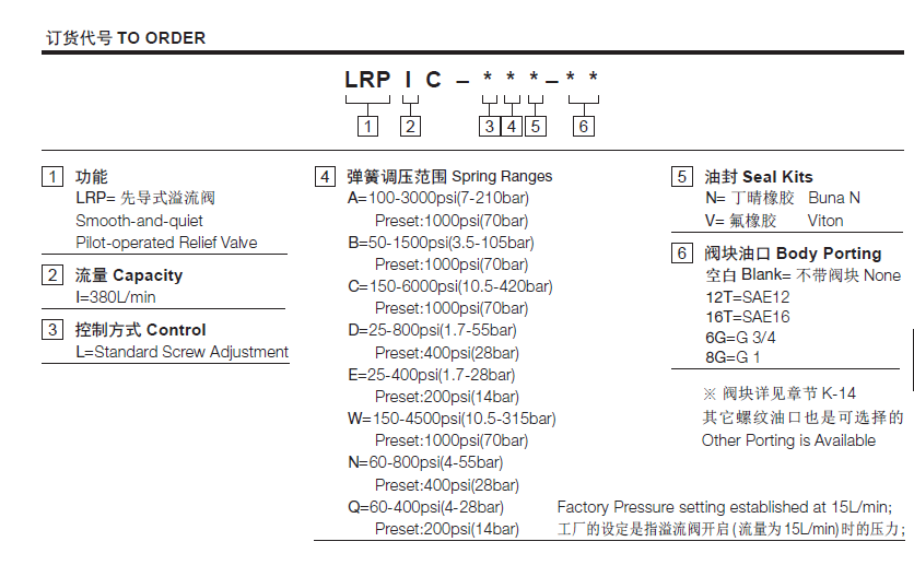工作压力350Bar流量380 L/min.插孔SUN T-16A过滤参考《油液清洁度》内泄漏50 cc/min. at 70 bar响应时间10 ms弹簧调压范围A 7 to 210 bar, preset预设定:70bar