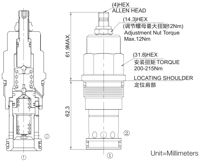 W 10.5 to 315 bar, preset预设定:70bar温度-40°F to +250°F(-40°C to +120°C)油液Mineral-based fluids with viscosities of 7.4 to 420 cSt.(矿物油粘度)阀块材料钢和球铁允许使用最大压力350bar -