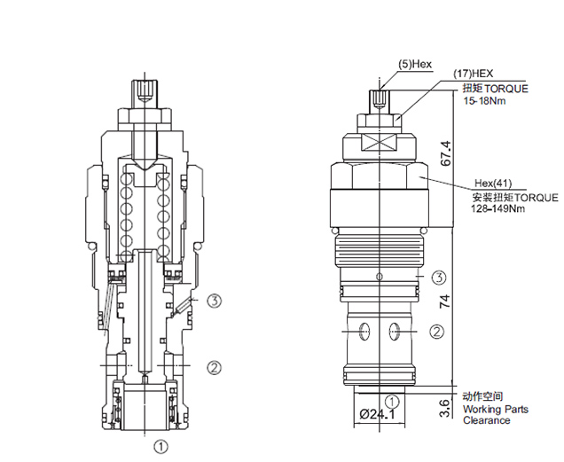 带先导开启平衡阀用于控制超越负载工况。油液从②口到①口单向自由流动;油液经直动,先导辅助从①口溢流到②口,③口是溢流辅助控制口,按控制比降低溢流功能的有效设定值。