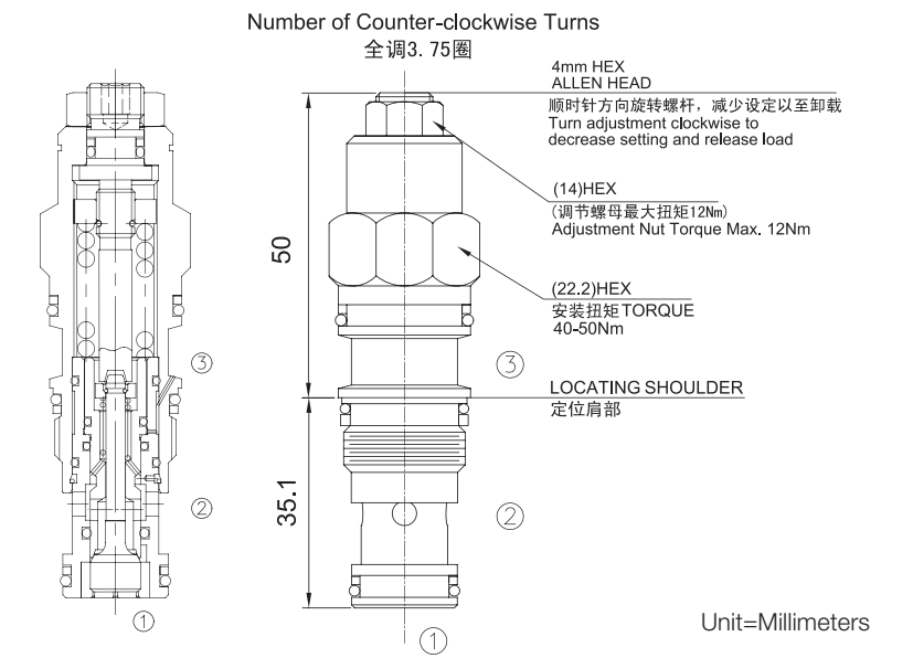 带先导开启平衡阀用于控制超越负载工况。油液从②口到①口单向自由流动;油液经直动,先导辅助从①口溢流到②口,③口是溢流辅助控制口,按控制比降低溢流功能的有效设定值。