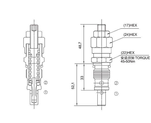 当①口压力达到设定压力时, 从①口到②口打开,以防止系统过载。②口的背压叠加