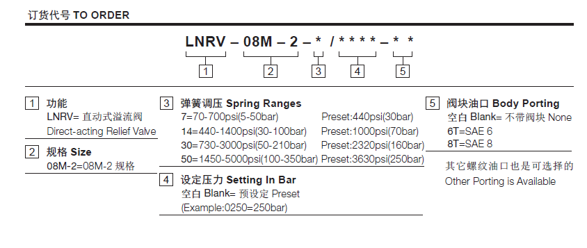 100 to 350 bar ; preset(预设定)250 bar温度-40°F to +250°F(-40°C to +120°C)油液Mineral-based fluids with viscosities of 7.4 to 420 cSt.(矿物油粘度)阀块材料钢和球铁允许使用最大压力350bar -