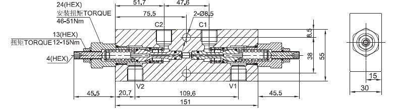 双向平衡阀对流入和流出执行机构的油液进行动静态负载控制。这个阀组分两个部分, 每个部分包含一个单向阀和一个由