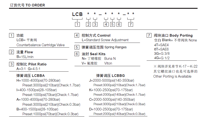 流量请查看《压力-流量曲线图》插孔SUN T-11A过滤参考《油液清洁度》最大设定值350 bar最大负载270 bar内泄漏5 drops/min(滴/分).控制比4.5:1温度-40°F to +250°F(-40°C to +120°C)油液Mineral-based fluids with viscosities of 7.4 to 420 cSt.(矿物油粘度)阀块材料6061-T6铝,允许使用最大压力207bar 钢和球铁允许使用最大压力350bar -