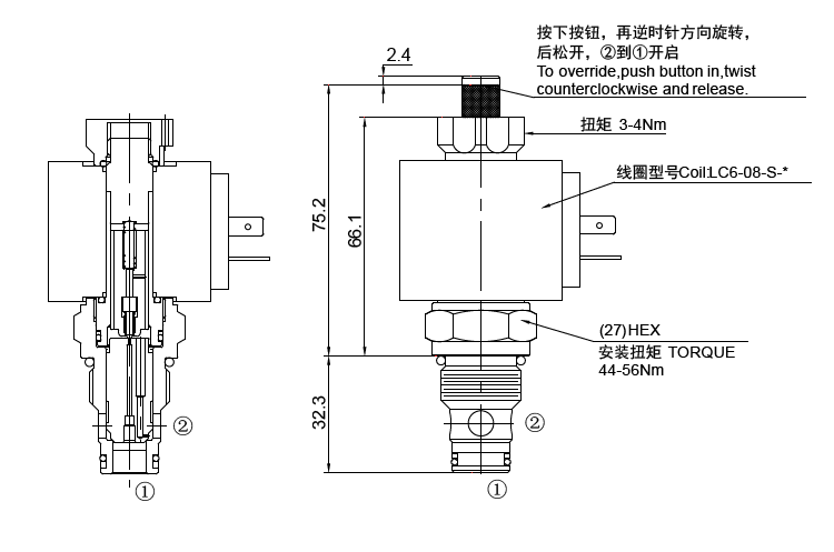 请按下按钮,再逆时针方向旋转180°,后松开,②到①开启;请按下按钮,再顺时针